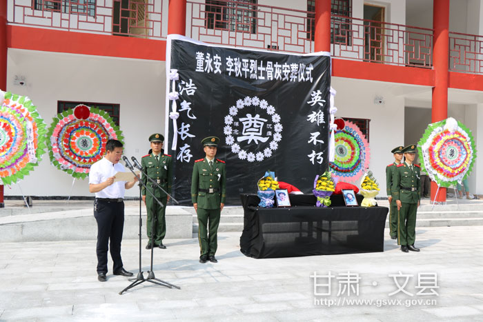 烈士骨灰安放仪式上,黄顺福代表县四大班子致辞,他说,我们将董永安、李秋平两位烈士骨灰安葬在他们挚爱的家乡,随后还要将文县籍烈士逐步接回安葬,让烈士的英魂与家乡的青山绿水共眠,让他们眼看着家乡在希望中一步步走向美丽、富裕、发达、兴旺。生前战友代表及亲属分别作了发言,最后由武警战士对董永安和李秋平烈士骨灰进行安放。